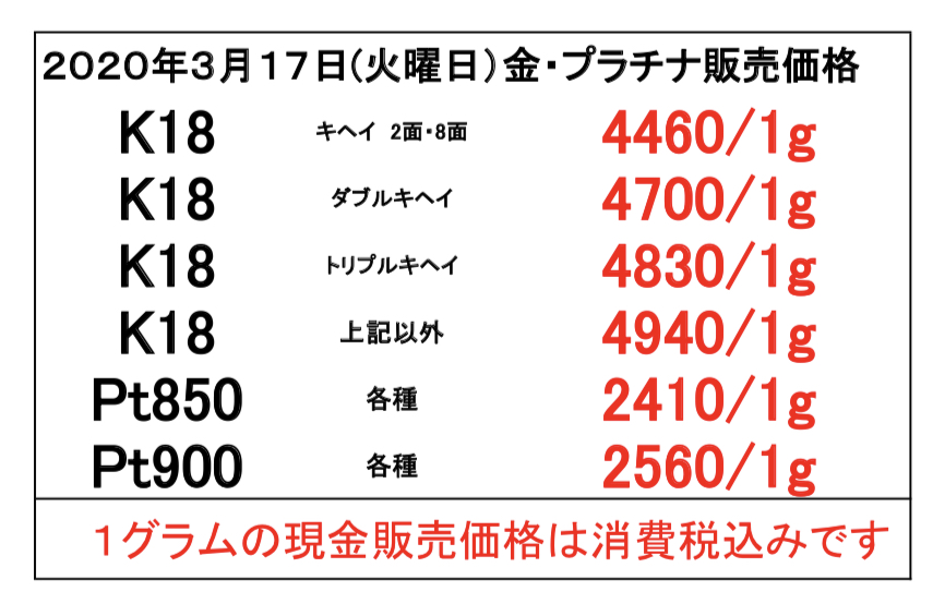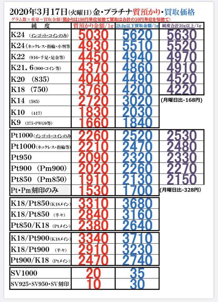 2020年3月17日(火曜日)金・プラチナ質預かり・買取価格