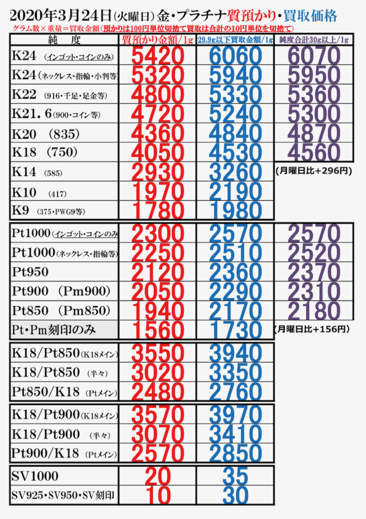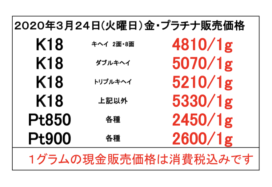 2020年3月24日(火曜日)金・プラチナ質預かり・買取価格