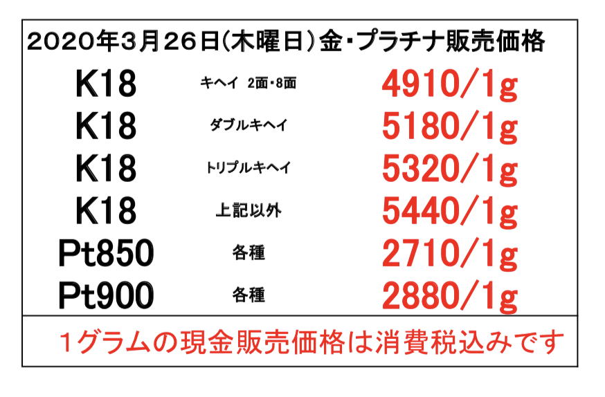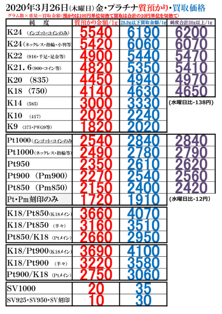2020年3月26日(木曜日)金・プラチナ質預かり・買取価格