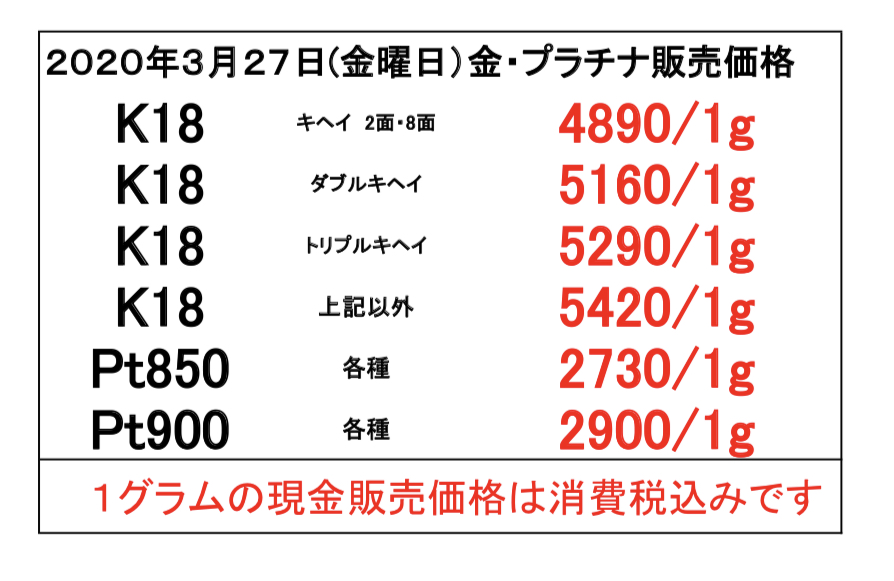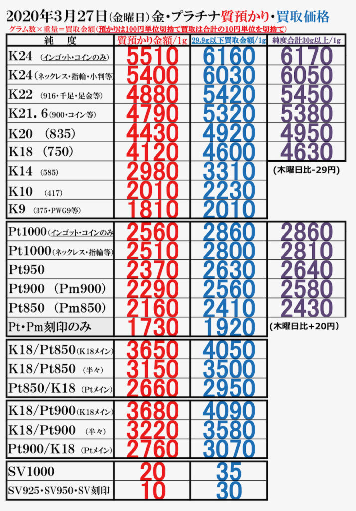 2020年3月27日(金曜日)金・プラチナ質預かり・買取価格
