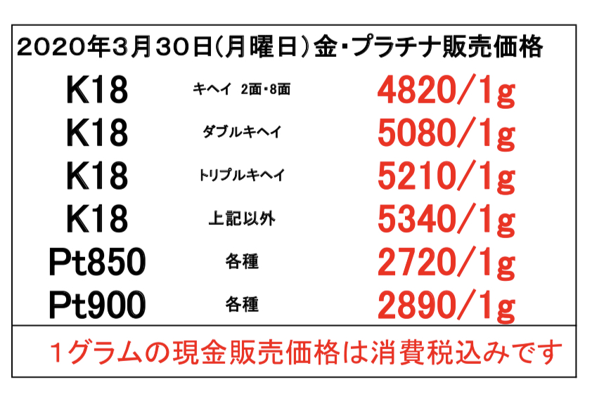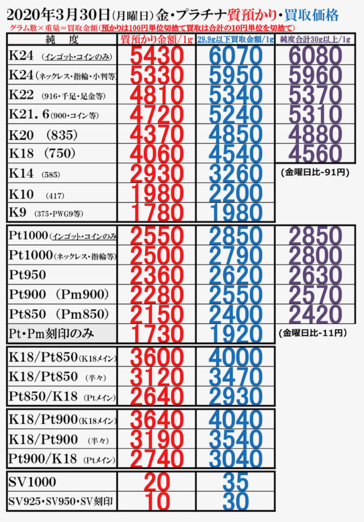 2020年3月30日(月曜日)金・プラチナ質預かり・買取価格