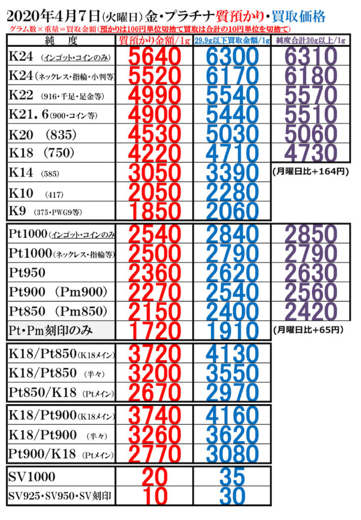 2020年4月7日(火曜日)金プラチナ質預かり・買取価格