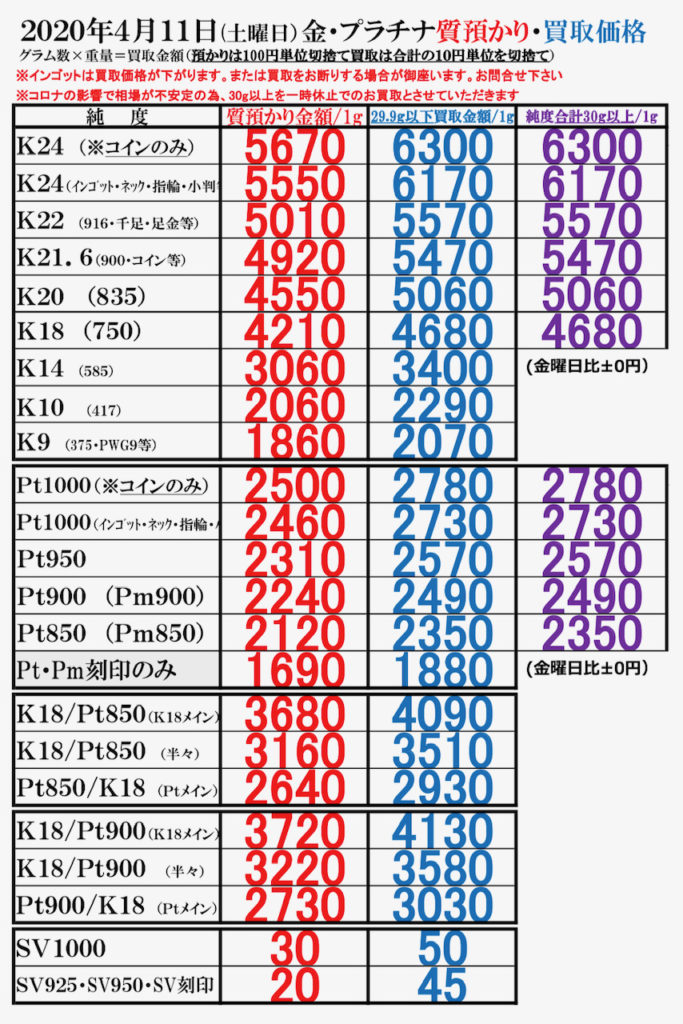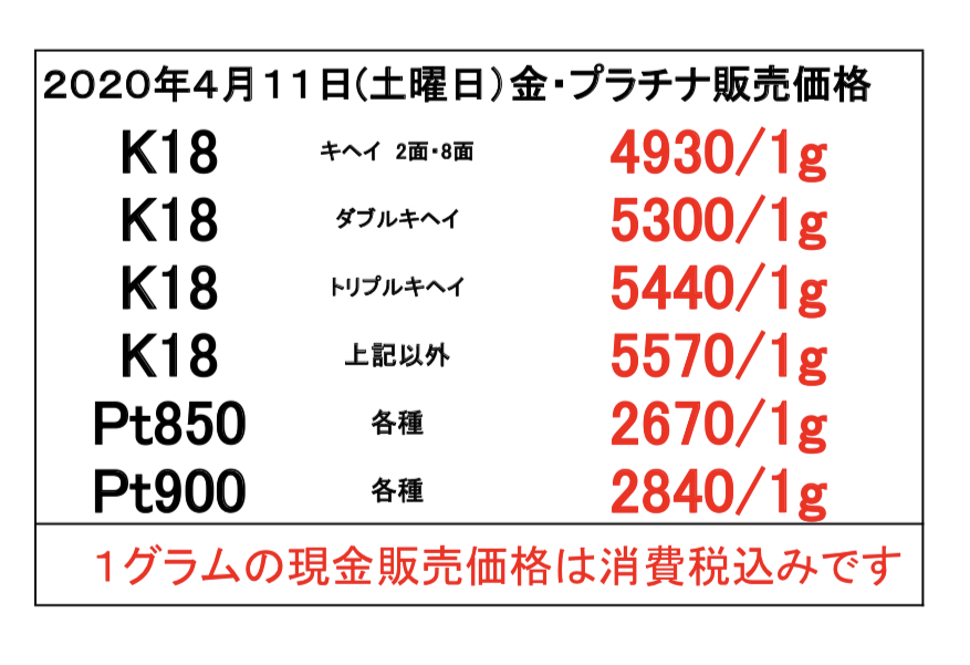 2020年4月11日(土曜日) 本日の金・プラチナのお取引価格一覧です ※コロナ関係で価格・取引品目に変動があります ・当日の営業時間内においても相場変動に伴い当店買取価格も変更いたします その際は店頭掲示の価格を優先させていただきます ・ゴールドとプラチナインゴットの買取価格が下がります。また、重量によってはお買取をお断りする場合があります ・30g超の高価格買取は一時休止させて頂きます