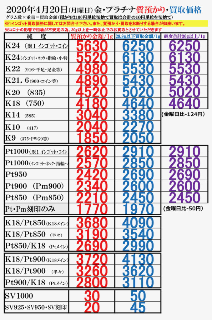 2020年4月20日(月曜日) 本日の金・プラチナのお取引価格一覧です