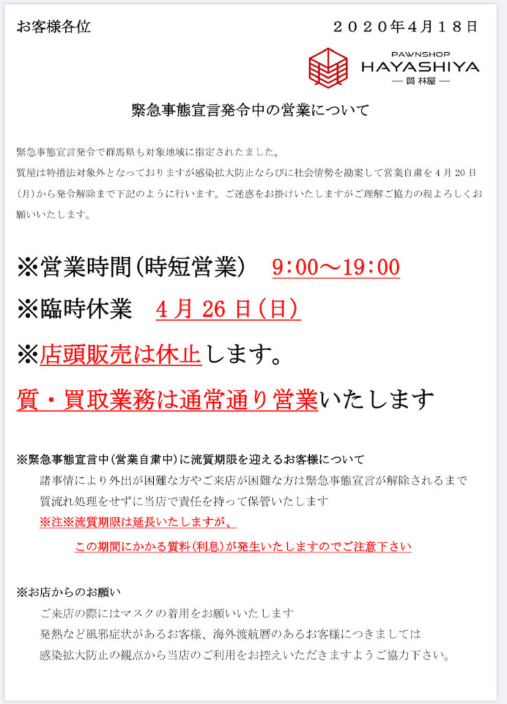 2020年4月26日(日曜日)営業自粛に伴い臨時休業致します