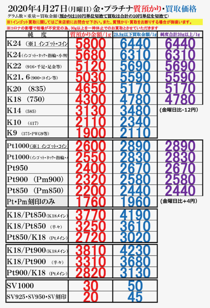 2020年4月27日(月曜日) 本日の金・プラチナのお取引価格一覧です