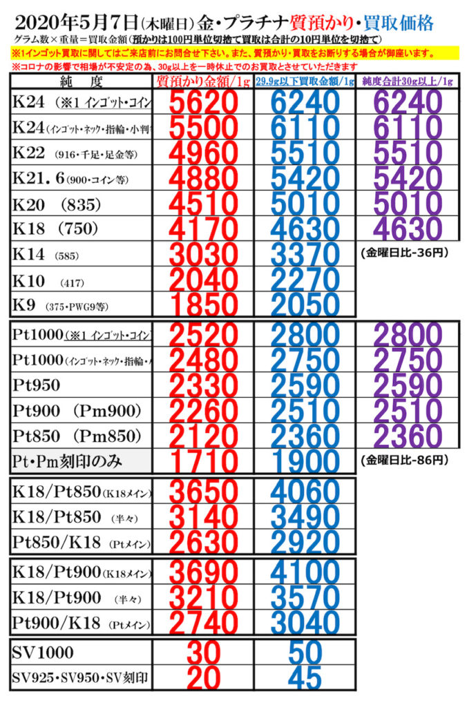 2020年5月7日(木曜日) 本日の金・プラチナのお取引価格一覧です