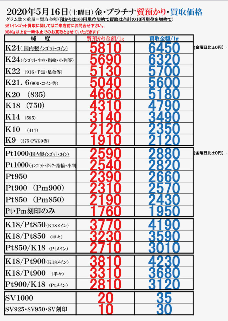 2020年5月16日(土曜日) 本日の金・プラチナのお取引価格一覧です ・当日の営業時間内においても相場変動に伴い当店買取価格も変更いたします その際は店頭掲示の価格を優先させていただきます ・ゴールドとプラチナインゴットの買取に関してはお問合せ下さい。また、質預かり・お買取をお断りする場合があります ・海外製インゴットの買取はお問合せ下さい ・30g超の高価格買取は一時休止させて頂きます