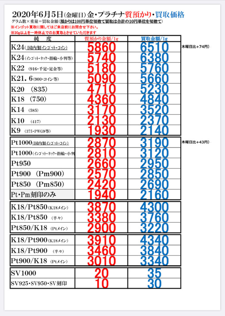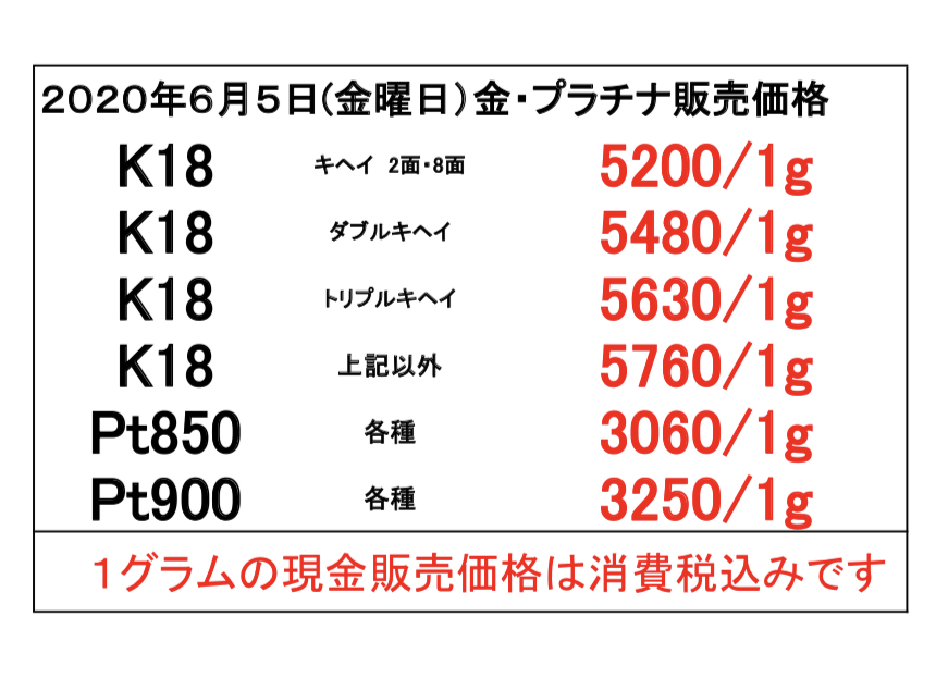 2020年6月5日(金曜日) 本日の金・プラチナのお取引価格一覧です ・当日の営業時間内においても相場変動に伴い当店買取価格も変更いたします その際は店頭掲示の価格を優先させていただきます ・海外製の100g以上のインゴットは買取できません ・30g超の高価格買取は一時休止中です