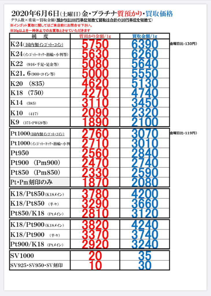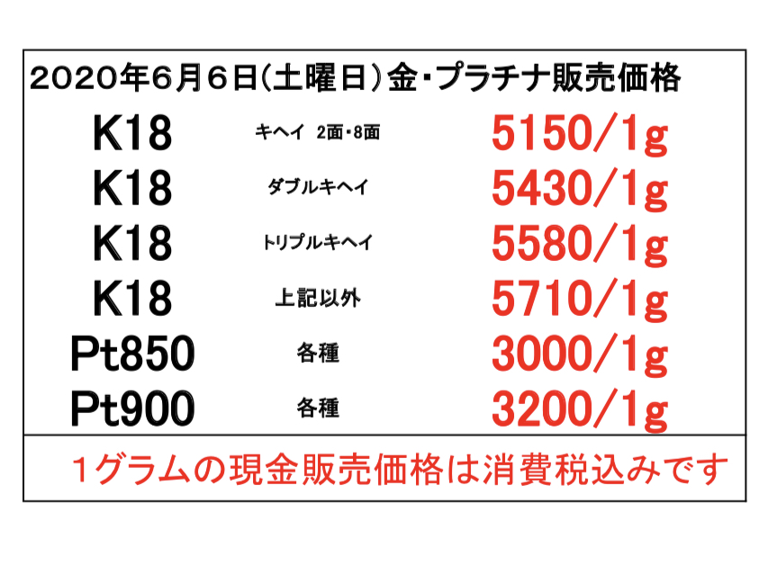 2020年6月6日(土曜日) 本日の金・プラチナのお取引価格一覧です ・当日の営業時間内においても相場変動に伴い当店買取価格も変更いたします その際は店頭掲示の価格を優先させていただきます ・海外製の100g以上のインゴットは買取できません ・30g超の高価格買取は一時休止中です