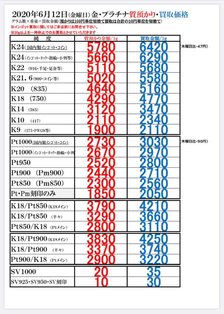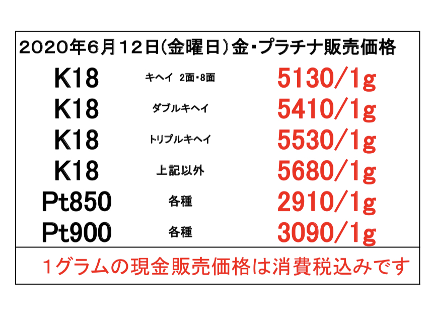 2020年6月12日(金曜日) 本日の金・プラチナのお取引価格一覧です ・当日の営業時間内においても相場変動に伴い当店買取価格も変更いたします その際は店頭掲示の価格を優先させていただきます ・海外製の100g以上のインゴットは買取できません ・30g超の高価格買取は一時休止中です