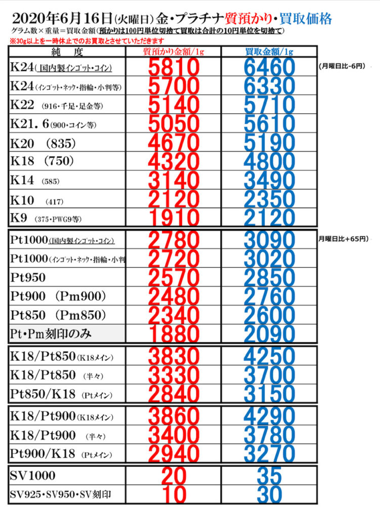 2020年6月16日(火曜日)金プラチナ質預かり・買取価格