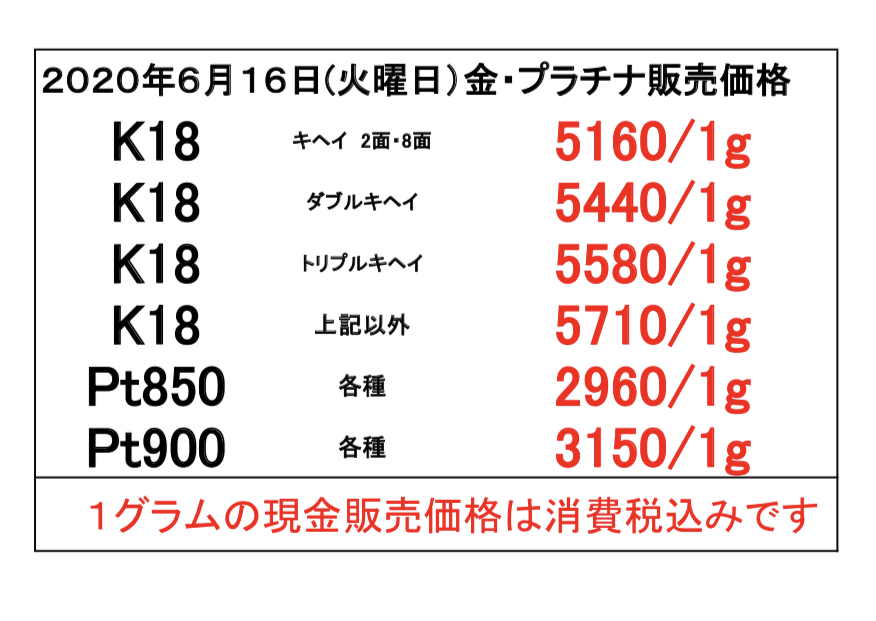 2020年6月16日(火曜日) 本日の金・プラチナのお取引価格一覧です