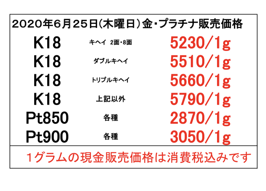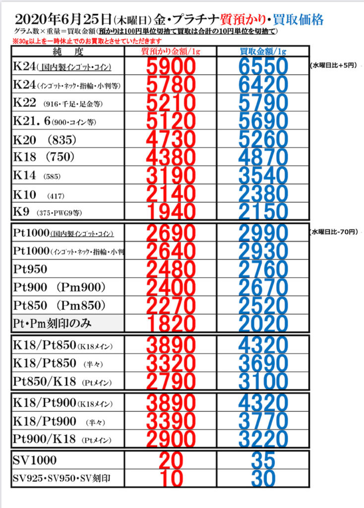 2020年6月25日(木曜日) 本日の金・プラチナのお取引価格一覧です ・当日の営業時間内においても相場変動に伴い当店買取価格も変更いたします その際は店頭掲示の価格を優先させていただきます ・海外製の100g以上のインゴットは買取できません ・30g超の高価格買取は一時休止中です