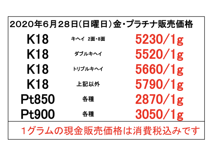 2020年6月28日(日曜日) 本日の金・プラチナのお取引価格一覧です ・当日の営業時間内においても相場変動に伴い当店買取価格も変更いたします その際は店頭掲示の価格を優先させていただきます ・海外製の100g以上のインゴットは買取できません