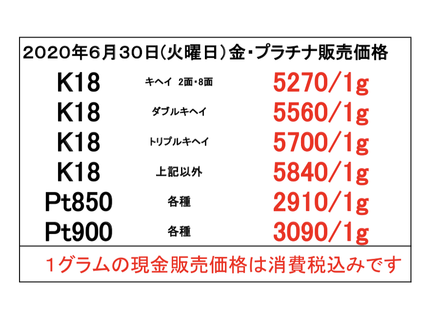 2020年6月30日(火曜日) 本日の金・プラチナのお取引価格一覧です ・当日の営業時間内においても相場変動に伴い当店買取価格も変更いたします その際は店頭掲示の価格を優先させていただきます ・海外製の100g以上のインゴットは買取できません