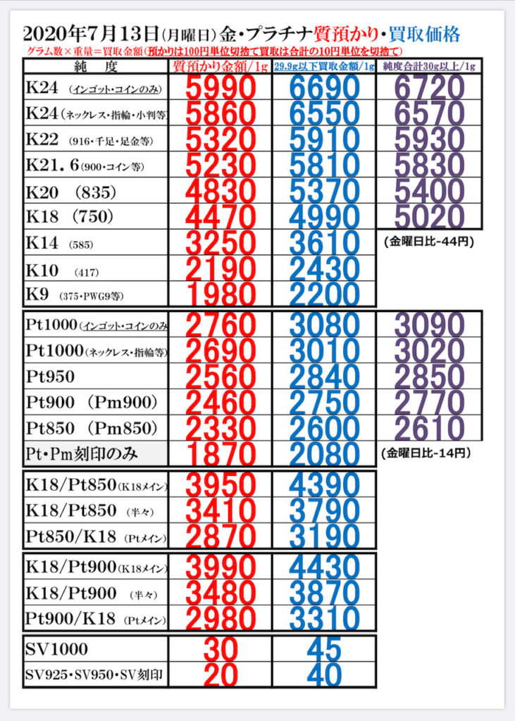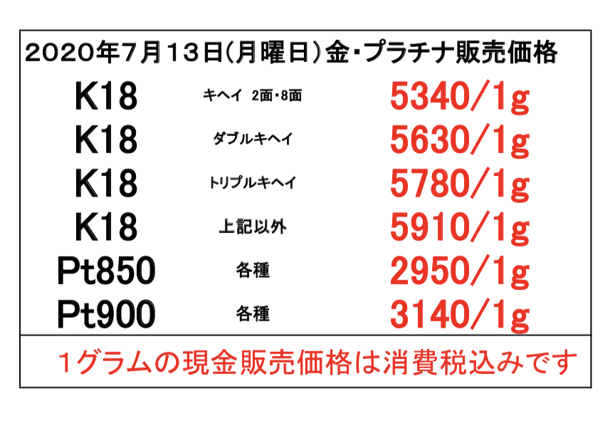 2020年7月13日(月曜日) 本日の金・プラチナのお取引価格一覧です ・当日の営業時間内においても相場変動に伴い当店買取価格も変更いたします その際は店頭掲示の価格を優先させていただきます ・海外製の100g以上のインゴットは買取できません