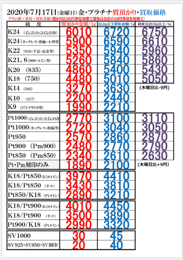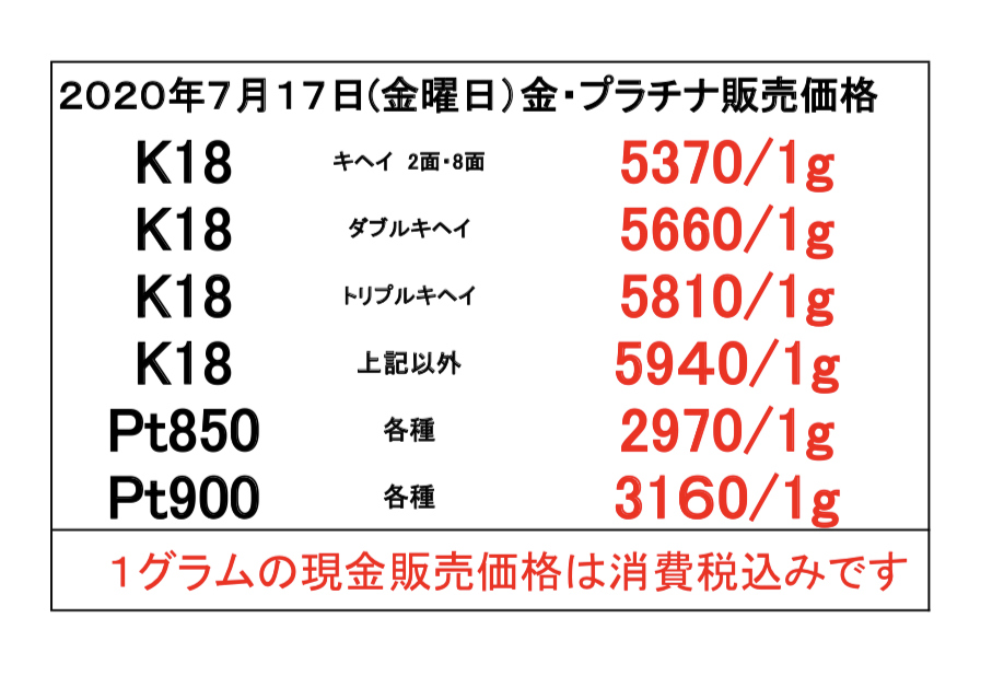 2020年7月17日(金曜日) 本日の金・プラチナのお取引価格一覧です ・当日の営業時間内においても相場変動に伴い当店買取価格も変更いたします その際は店頭掲示の価格を優先させていただきます ・海外製の100g以上のインゴットは買取できません