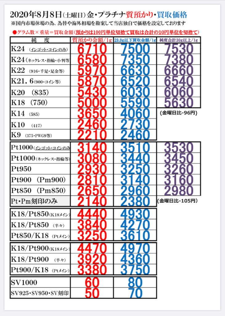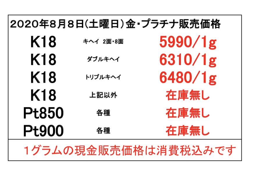 2020年8月8日(土曜日) 本日の金・プラチナのお取引価格一覧です ※本日若干値を下げておりますが 国内金相場は史上最高値更新の歴史に残る超高価格です ・当日の営業時間内においても相場変動に伴い当店買取価格も変更いたします その際は店頭掲示の価格を優先させていただきます ・海外製の100g以上のインゴットは買取できません